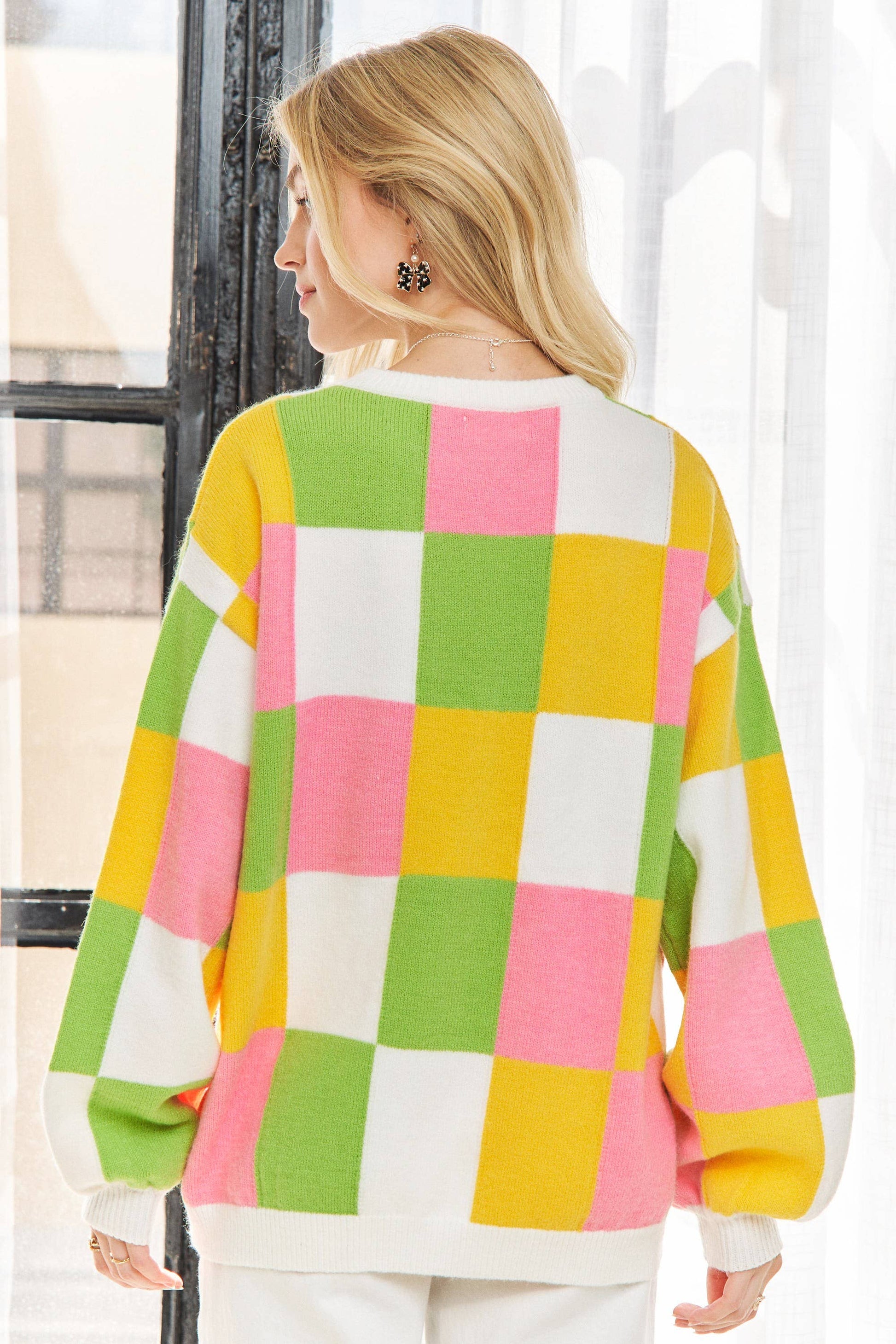 Rock a look that turns heads with this playful colorblock sweater. The eye-catching geometric design pairs perfectly with its buttery-soft knit fabric and effortless drape. Built for comfort with a relaxed fit and long sleeves, it's your go-to piece for laid-back days that still demand style.