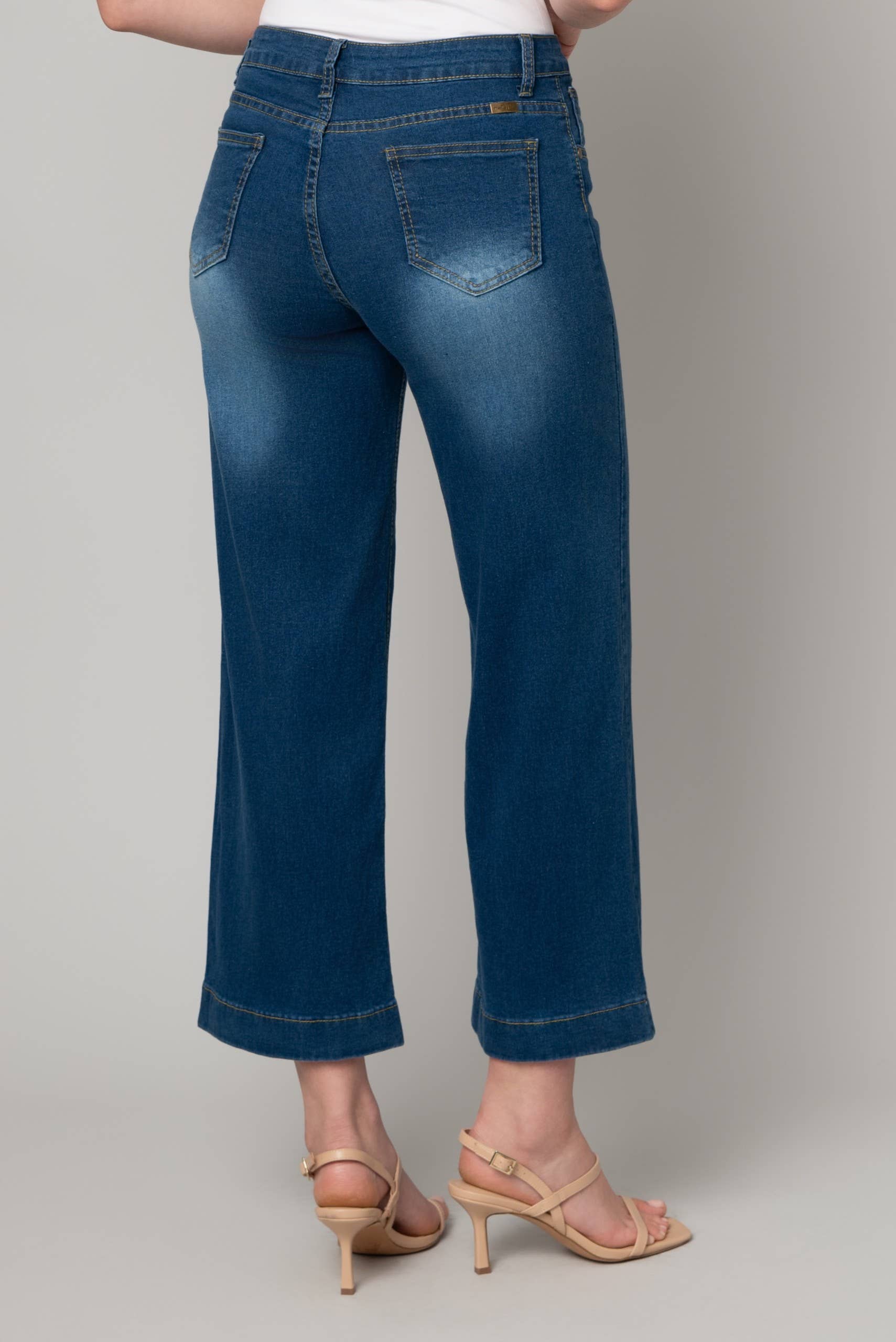 These aren't your average jeans—they're the confident, curve-hugging pair that actually fits. The mid-rise cut pairs perfectly with a stretchy fabric that moves with you, while the wide-leg silhouette keeps things effortlessly cool. Dark medium wash, five pockets, belt loops, and a little lift where it counts. Comfort meets style in one seriously wearable denim.