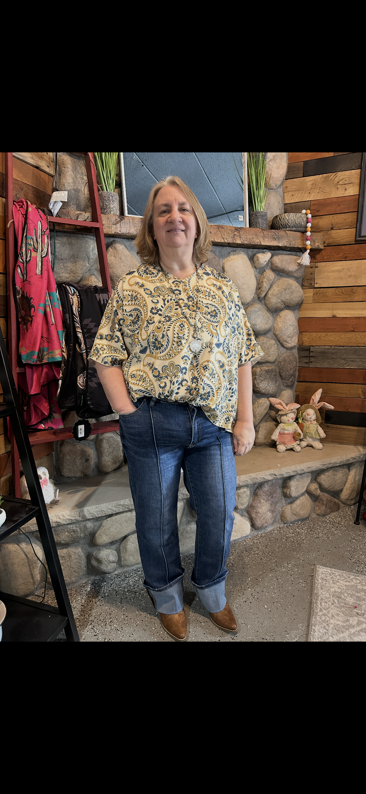 Meet the Cactus Kreek Top—your new favorite way to add a splash of whimsy to your closet! This cream-colored beauty features a stunning paisley design in jewel tones of green, turquoise, and mustard that'll have you turning heads. Perfect for mixing and matching with your everyday essentials, this playful piece brings just the right amount of personality without trying too hard. Comfort meets style in the most delightful way. 95% Polyester 5% Spandex