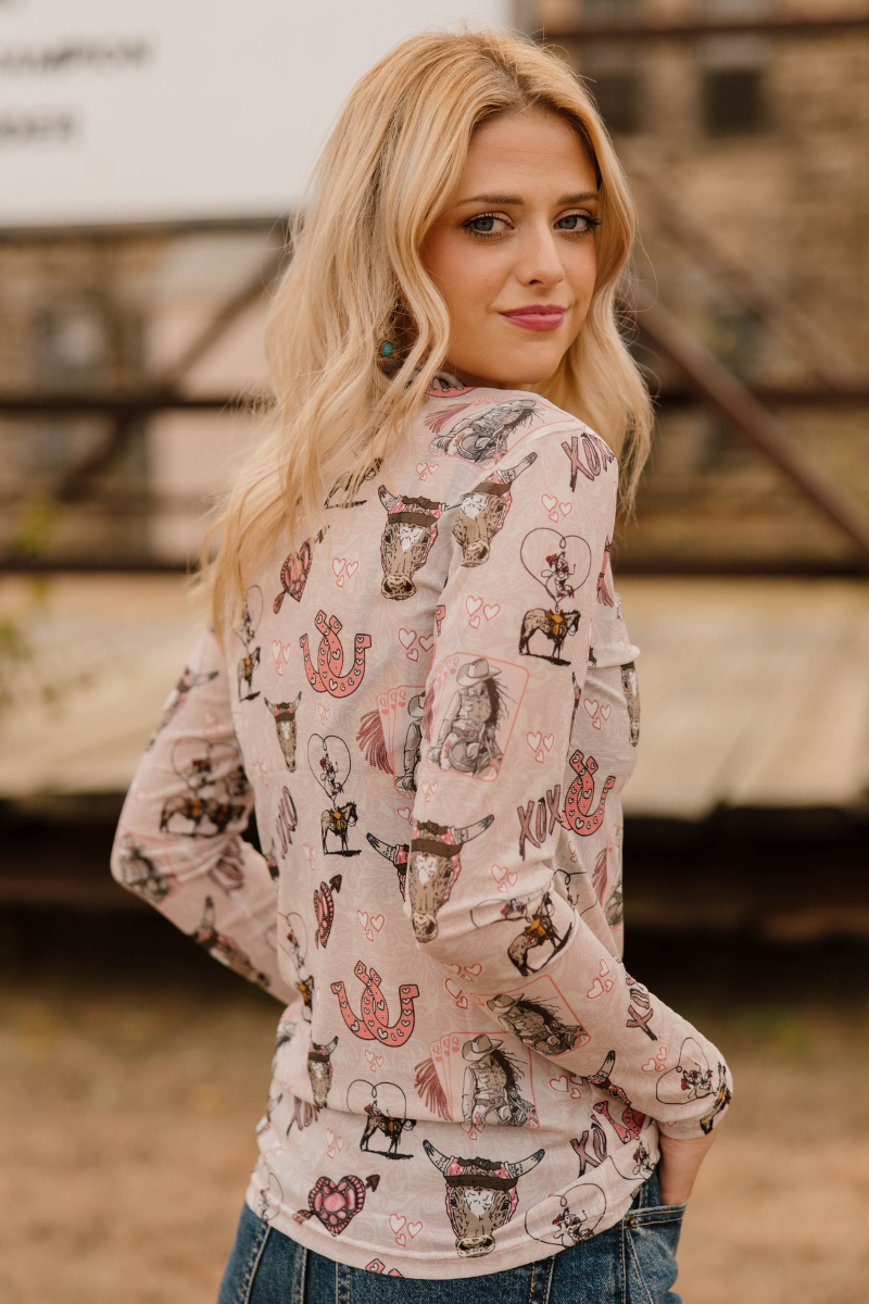 Show your rodeo passion with the XOXO Rodeo Mesh Top, designed to captivate with its romantic Valentine’s theme. Featuring delicate horse shoes, heartfelt “XOXO” details, and an inspiring image of a girl creating a heart with her horse through rope tricks, this mesh top combines style and sentiment. Lightweight and eye-catching, it’s the perfect choice to express your love for horses and turn heads this Valentine’s Day. Don’t miss out on adding this unique piece to your wardrobe. 96% Polyester 4% Spandex